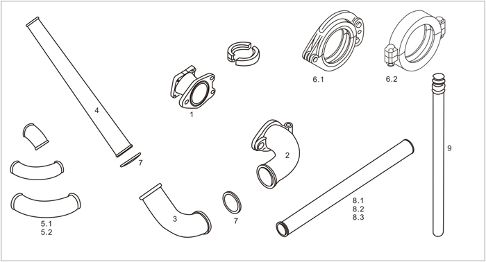 pos Name Description 1 Connection bend 14°DN180 2 Reduction elbow 90°DN180/150 3 Elbow 90°DN150 4 Reducing pipe DN150/125 1600mm Reducing pipe DN150/125 1460mm Elbow DN125 5.5″ 90° 5.1 Elbow DN125 5.5″ 45° Elbow DN125 5.5′ 30° Elbow DN125 5.5″ 14° Twin-wall elbow DN125 5.5″ 90° 5.2 Twin-wall elbow DN125 5.5″ 45°